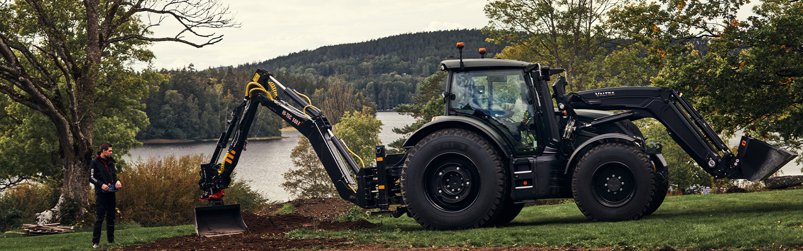 Med Valtra Unlimited kan du få grävaggregat fabriksmonterade på din traktor. Det gör din traktor till en multifunktionell maskin för både grävning och schaktning.