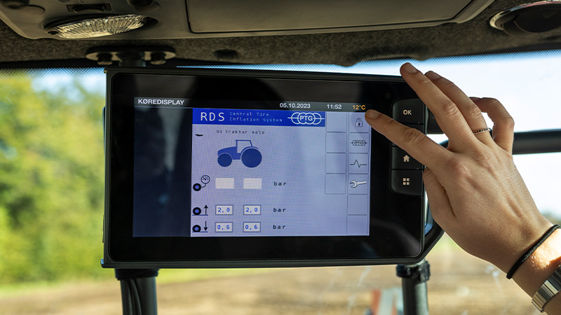 Vårt intelligenta centrala däcktrycksreglering (CTIS) sparar både tid och pengar samtidigt som det skyddar markstrukturen. Systemet som installeras av Unlimited styrs via ISOBUS och visar aktuellt däcktryck direkt på SmartTouch-skärmen.